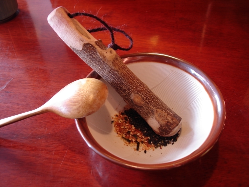 附上一支原木的棒子讓你磨,小湯匙是用來攪拌豬排醬用的。