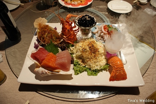 婚宴是在文心南路的女兒紅辦的,場地還不錯哦!很氣派,只是柱子多了點,至於好不好吃嘛,我老是想著是不是要去拍一下照,所以就沒有好好品嚐了,不過還記得雞湯不錯喝,飯後甜點居然是起司蛋糕,太優了!呵…