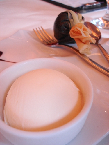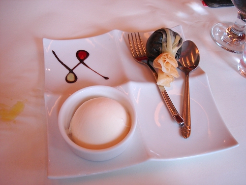 對於喜歡甜食的我而言,這道真的是美味啦!剛送來的時候還不知道怎麼吃,先把法式薄餅包裹巧克力炸過?的巧克力袋敲開,微熱的巧克力就慢慢的流出來啦!再用湯匙把巧克力醬跟冰淇淋一起送入口中,讚啦!尤其沾有巧克力的酥脆法式薄餅更是美味啦!XD