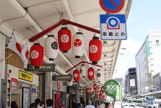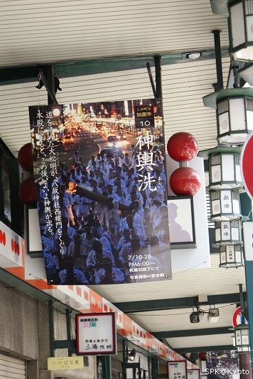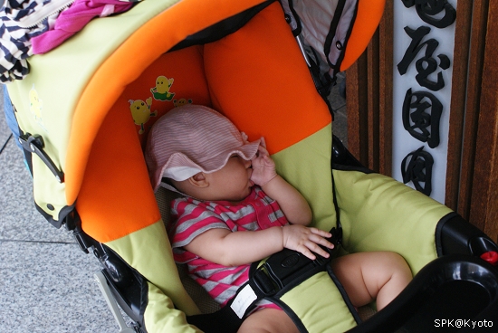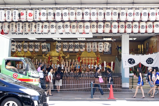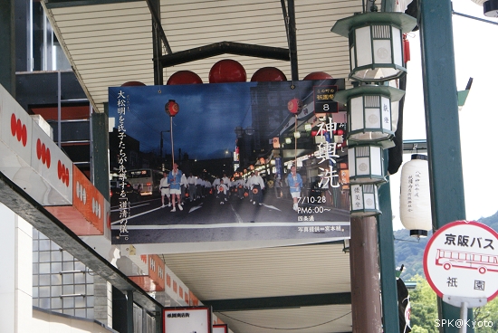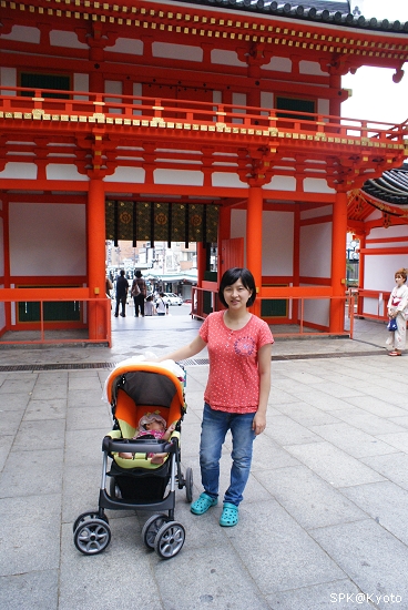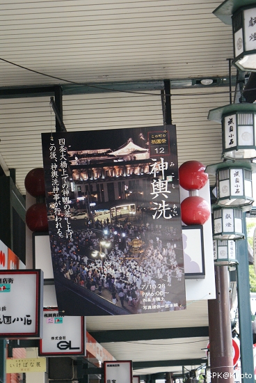 不到50分鐘的時間,一下子就到京都祇園囉!其實我們去的前二天正好就是「日本三大祭」之一的「祇園祭」,不過因為我們帶著小希,參加這種人山人海的盛會實在有點危險,所以只好作罷,不過祇園祭年年會有,總是有機會來的啦!四條通兩邊的店家門口都可以看到貼有祇園祭奉納的紙條,就是就像媽祖出巡時也會有許多民間團體贊助的意思吧!