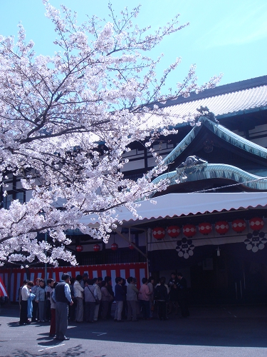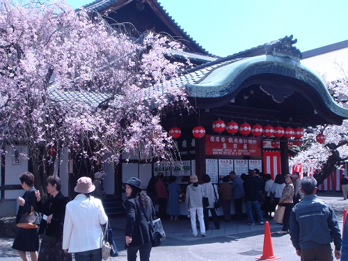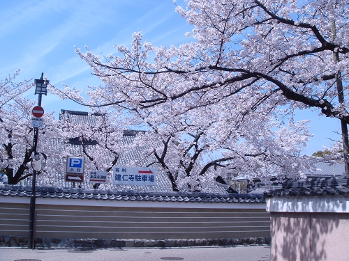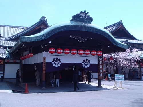 離開八坂神社之後,我們繼續趕路前往祇園的「甲部歌舞練場」,因為我們預約了12:30的場次看一年只公演一個月的「都をどり」藝伎表演,路上經過了建仁寺門口,哇~這個滿是盛開櫻花的轉角實在太美了!XD
