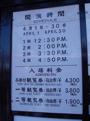 每天有四個場次,演出時間大約1小時,我們買的是二等自由席1900日元的票。